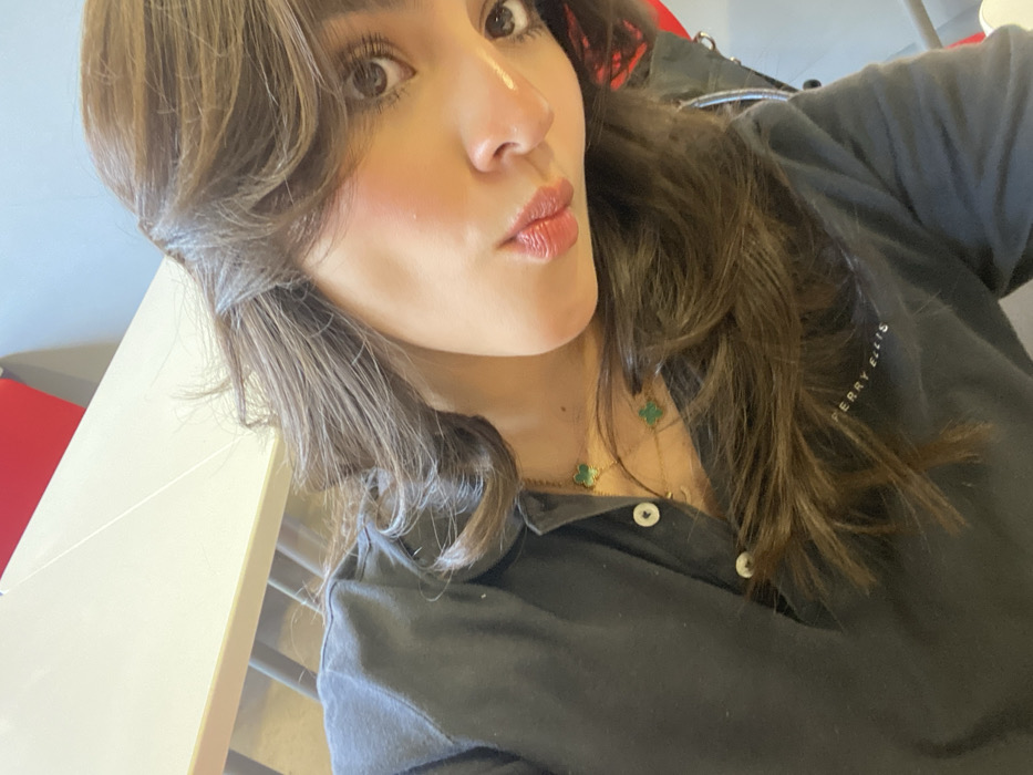 A female individual is depicted in a close-up selfie, angled slightly upward