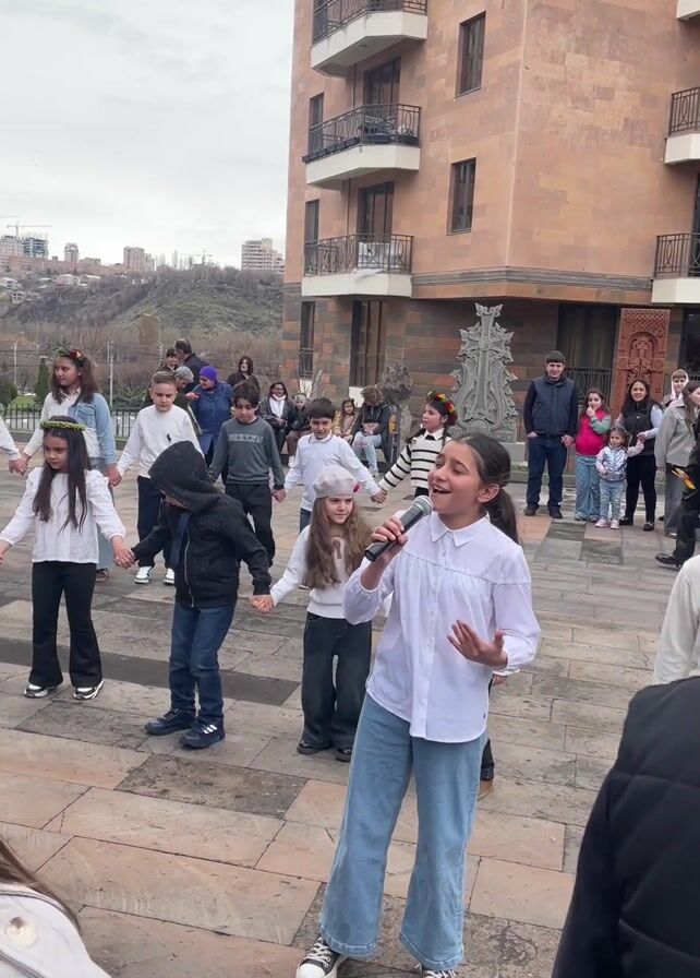 A group of children of various ages are shown in the video. They stand in a circle in an open paved area in front of a tan brick building, holding hands and dancing. Most of the children are dressed in light colored clothing. One child in the foreground holds a microphone and sings. Some of the children and adults standing around the circle are wearing flower crowns. A small crowd of people watch the children. In the background, a cityscape of buildings and hills is seen on a cloudy day. A decorative stone sculpture stands on a wall behind the children.