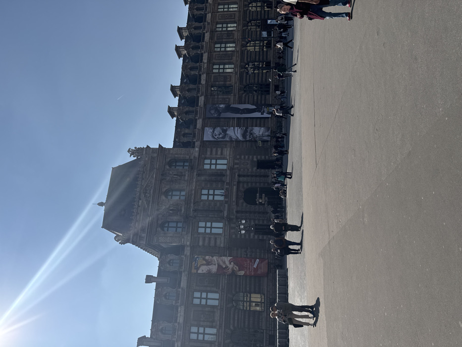 The image displays a wide view of a section of the Louvre Museum in Paris, France, under a clear, bright blue sky with a prominent sun flare originating from the upper left. The main subject is a large, multi-story stone building exhibiting classical French architecture, characterized by ornate facades, numerous rectangular and arched windows with white frames, and a dark, steeply pitched roof incorporating dormer windows. Multiple large vertical banners are affixed to the building's facade; one on the left displays artwork and the text "Le bel inconscient," while two on the right feature classical sculptures, with one explicitly mentioning "Michel-Ange." The foreground and mid-ground are comprised of an expansive, light-colored paved plaza. Various individuals and small groups are scattered across this area. On the immediate foreground left, two individuals stand facing each other. Further back on the left, a group of three individuals walks away from the viewer, heading towards the building. In the foreground right, a partially visible person, clad in a dark jacket, blue jeans, and red shoes, faces left. Numerous other pedestrians are observed walking across the plaza in diverse directions, with denser clusters located near the building's central arched entrance. A dark, ornate lamppost with multiple light fixtures is situated in front of the building's facade. A faint contrail from an aircraft is visible in the upper right of the sky.