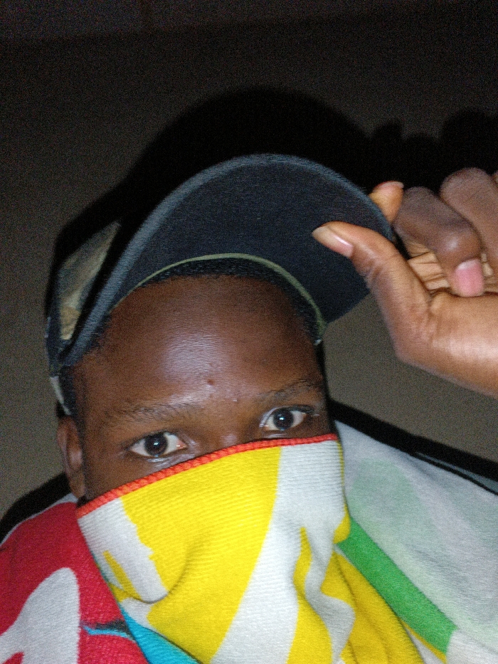A close-up shot reveals a person partially obscured by a colorful towel featuring red, yellow, white, and green stripes. Only the eyes and forehead are visible above the towel's edge. The person wears a dark baseball cap, which is being held up by their hand. The background appears dark and indistinct, suggesting a dimly lit setting.