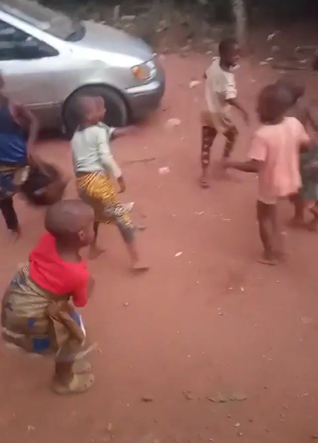 Several young children are playing in a dirt yard. A silver car is parked nearby. The children are wearing various clothing, including traditional wraparound skirts and simple shirts. Some are barefoot. They are running around, dancing, and interacting playfully. Laundry is hanging on a clothesline in the background. The ground is red dirt. The scene appears to be outdoors in a rural area.