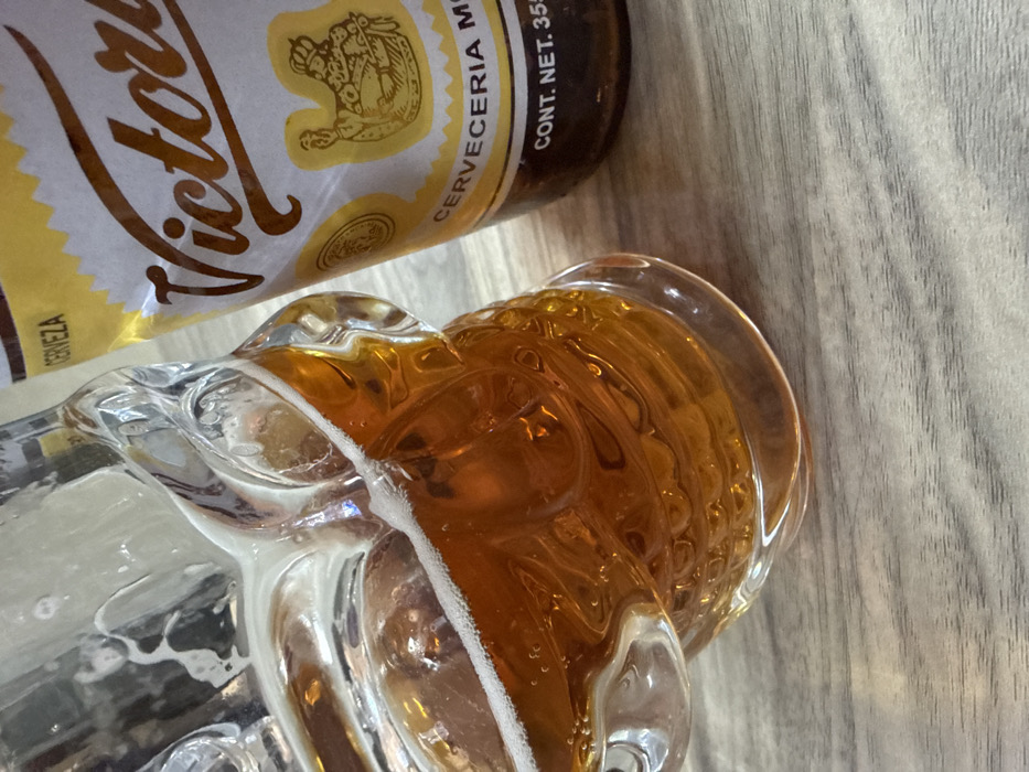 The image displays a clear glass mug containing an amber-colored liquid with a thin layer of white foam, positioned on a light-colored, horizontally-grained wooden or wood-patterned surface. The mug features an intricate, textured design that appears to be sculpted in the form of a human skull or similar ornate pattern. Partially visible to the right of the mug is a beer bottle with a white and yellow label. The label prominently displays the brand name "Victoria" in brown cursive script, above a golden emblem of a crowned, seated figure holding a scepter. Textual elements "CERVEZA," "CERVECERIA MOCTEZUMA," and "CONT. NET. 355ml" are legible on the bottle label. No individuals are present. The scene depicts a beverage setting, likely a bar or home environment, within Mexico City, Mexico, given the visible Mexican beer brand.