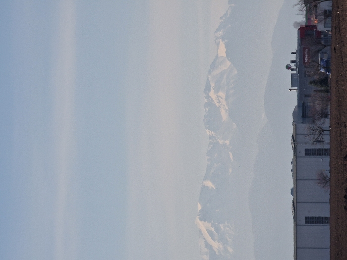 A panoramic, static daytime image captures an industrial complex situated in Hălchiu, Romania. The foreground consists of a dark brown, tilled field. In the midground, an industrial facility occupies the space, featuring a large, light-toned building on the left with multiple vertical rectangular panels. To the right, another industrial section includes a building with a prominent red facade and a structure bearing the "Miele" logo on its rooftop, which also supports various equipment and ventilation systems. Several bare deciduous trees are interspersed among the industrial structures. A light blue utility vehicle is partially visible near the red building. The background reveals multiple mountain ranges; the most distant peaks are distinctly snow-capped and bright white, contrasting with the hazier, lower grey ranges. The sky is a uniform, light blue with subtle atmospheric haze. No human figures or discernible actions are present.