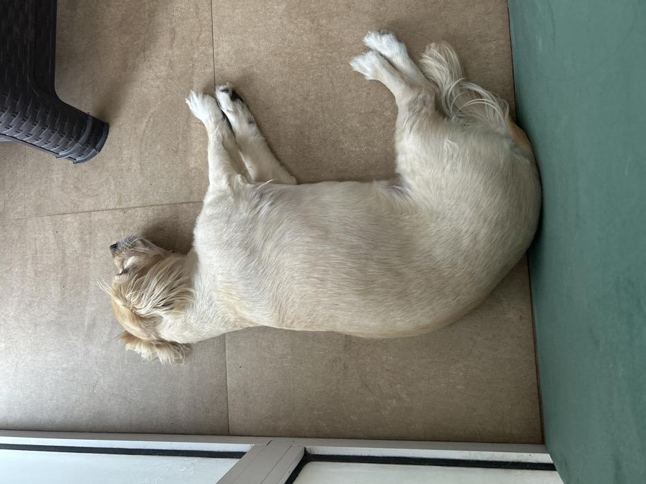 In a domestic setting within Villa San Andrés, Argentina, a light-colored dog is observed resting on a tiled floor. The animal, exhibiting blonde to light brown fur, lies on its left side, curled in a C-shape. Its head is positioned towards the upper right quadrant of the frame, with eyes closed, indicating a state of repose. The dog's front paws are extended forward, while its hind paws are tucked beneath its body. The floor consists of light brown square tiles with visible grout lines. A white door frame or window frame is present along the left vertical edge of the image. A dark brown, textured object, identified as the base of a piece of furniture, is partially visible in the upper right. A green mat or rug is situated along the bottom edge, partially beneath the dog's lower body.