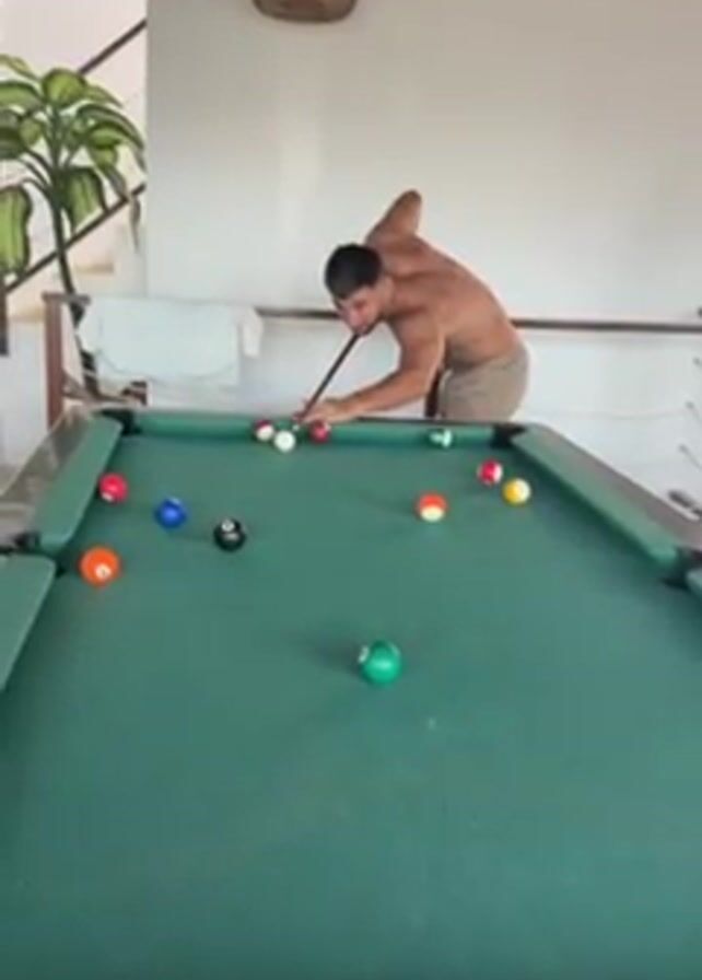 A shirtless man hits a pool ball on a green felt pool table. The man is tanned and athletic with short dark hair, a short beard, and visible tattoos on his torso. He is wearing beige shorts. The pool table has sixteen balls on it, in various colors and numbered, plus the white cue ball. The room is open with white walls and a woven basket lamp hanging from the ceiling. There is a stairwell in the background with a potted plant near the railing and a white towel hanging over the railing. After he hits the ball he stands and holds the pool cue in his hands.