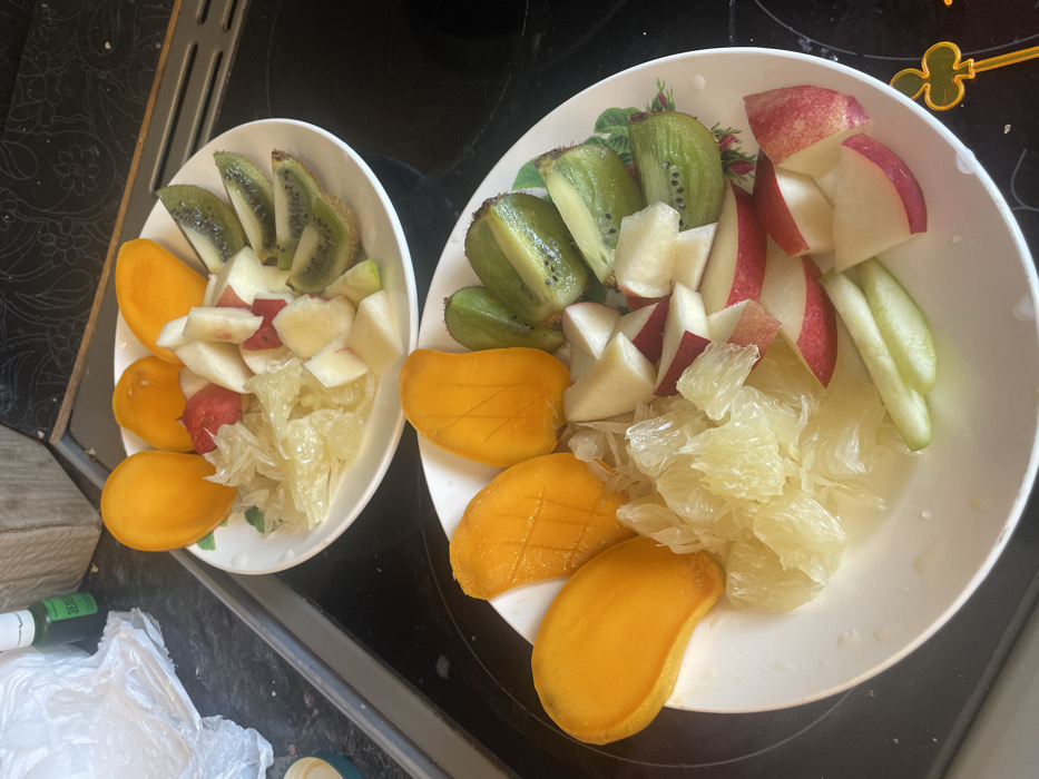 - "The scene, set in a kitchen within Tolyatti, Russia, displays two identical white circular plates laden with an assortment of cut fruits" by FM-6N9303, licensed under CC BY 4.0