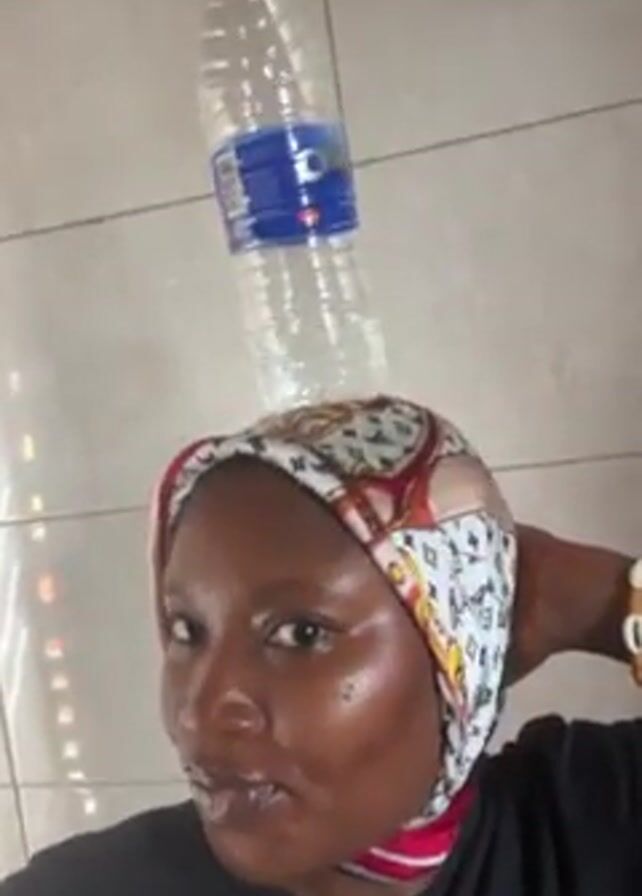 A woman balances a plastic water bottle on her head in front of a tiled wall. She is wearing a headscarf and a black shirt, and she looks at the camera. The water bottle is nearly full and has a blue cap. The tiles are light in color and appear to be a bathroom or hallway.