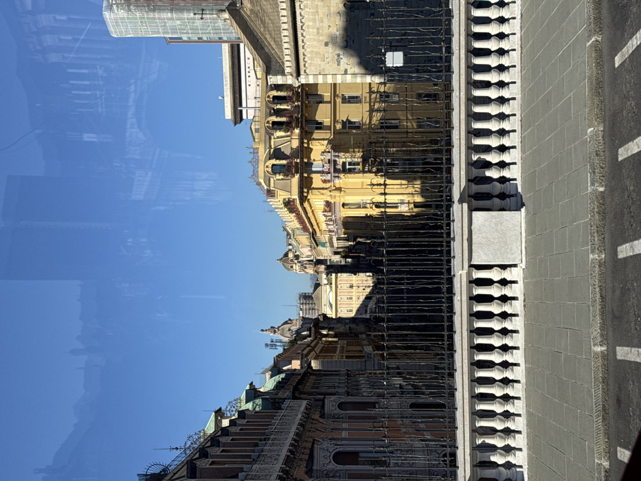 The image depicts an urban landscape in Genoa, Italy, specifically from an elevated perspective likely on Via Antonio Gramsci, looking towards the historic city center and its structures. In the foreground, a light gray tiled sidewalk with a darker gray curb transitions to a dark asphalt street marked with two faded white diagonal lines. Above the sidewalk, a decorative white stone balustrade features vertical pillars and horizontal railings, topped by a dark, ornate wrought-iron fence. Beyond the fence, a dense collection of buildings forms the midground and background. To the left, a multi-story historic building with an ornate, light peach-colored facade, intricate white architectural details, and multiple balconies with dark iron railings is visible. Its roof is sloped and dark green. Further into the scene, additional traditional Italian buildings with varying colors and styles are present. Prominently in the mid-right is a bright yellow, multi-story building featuring a distinctive mansard roof with several arched dormer windows, some adorned with small red floral planters. To its immediate right, a section of a stone building with a rough-hewn texture, possibly a church, is heavily shadowed on its visible side. In the background, a modern glass skyscraper with a cross visible near its peak rises above the historic skyline. The sky is clear and vivid blue, occupying the upper third of the image. Faint, diffuse reflections, consistent with a vehicle window, are visible across the sky area. The scene is illuminated by bright natural sunlight, casting distinct shadows from the right side of the frame. No individuals or active vehicles are present in the visible cityscape.