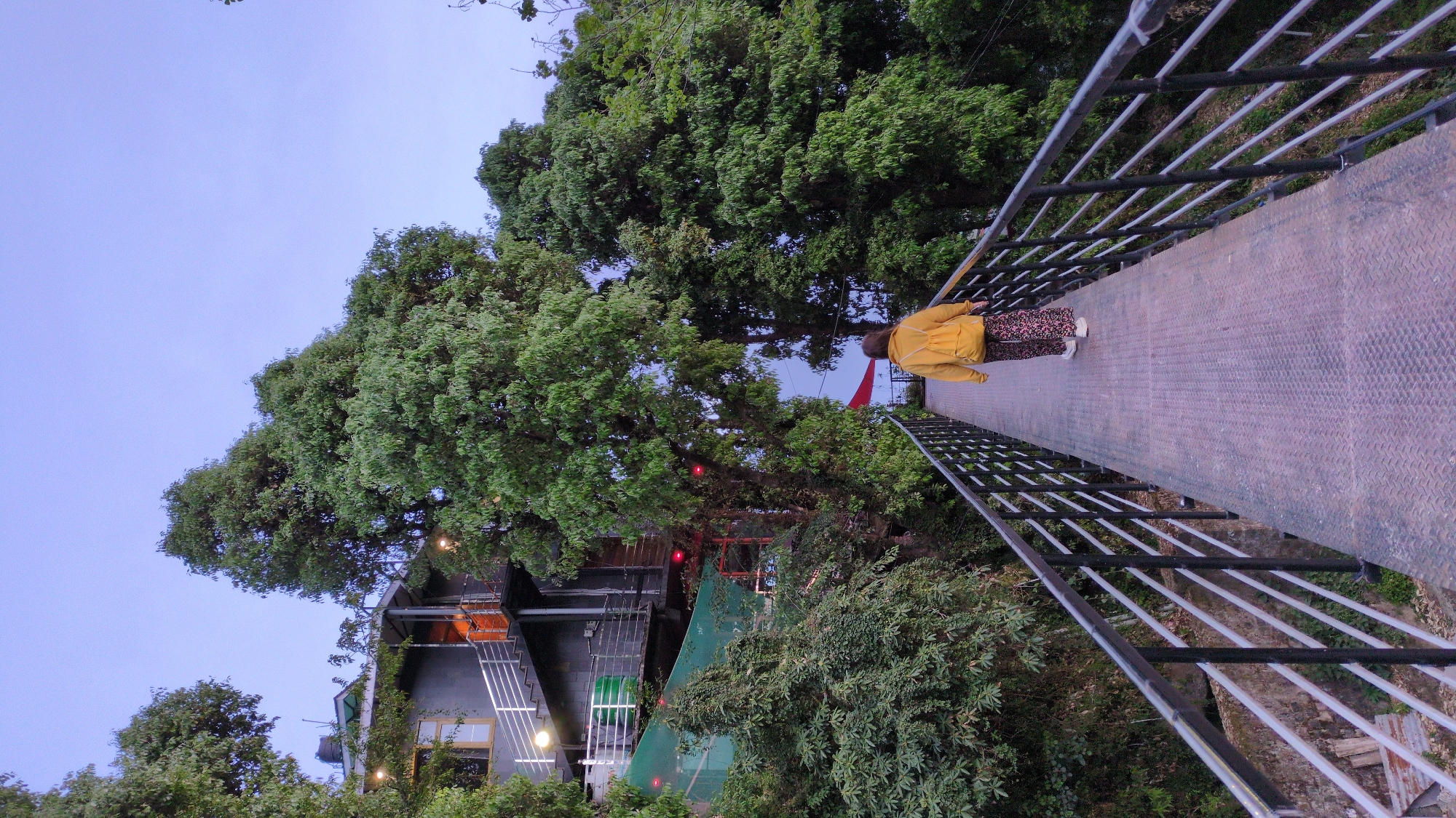 A low-angle shot shows a woman standing on a narrow metal bridge. She is wearing a mustard-yellow jacket over a floral-patterned dress. The bridge has black and white railings on either side. Lush green trees and foliage surround the structure. A building with exterior stairs and an orange accent is visible through the trees. The sky is a clear light blue.