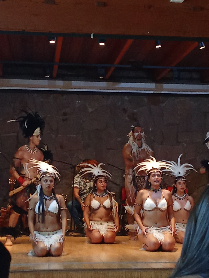 A group of performers is on a stage. Several women are kneeling and wearing tribal costumes. These costumes consist of white tops, beaded necklaces, feathered skirts and feathered headdresses. Male performers are standing behind the kneeling women. One man is holding a wooden instrument. There is a stone wall behind the performers. The ceiling is visible above the stone wall and has lights attached.