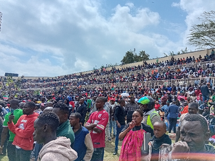 A wide-angle shot depicts thousands of individuals, predominantly African, densely packed within a large outdoor stadium under a partly cloudy sky