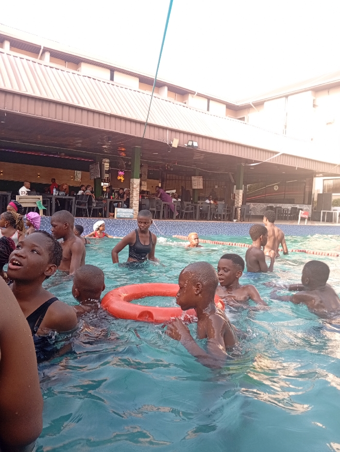 Several people swim in a pool outside a building. The swimmers are mostly children, many are dark-skinned. An orange life preserver floats in the pool. The building has a shaded patio area with tables and chairs, occupied by people. The pool's edge has a white tile border. The scene appears to be daytime.