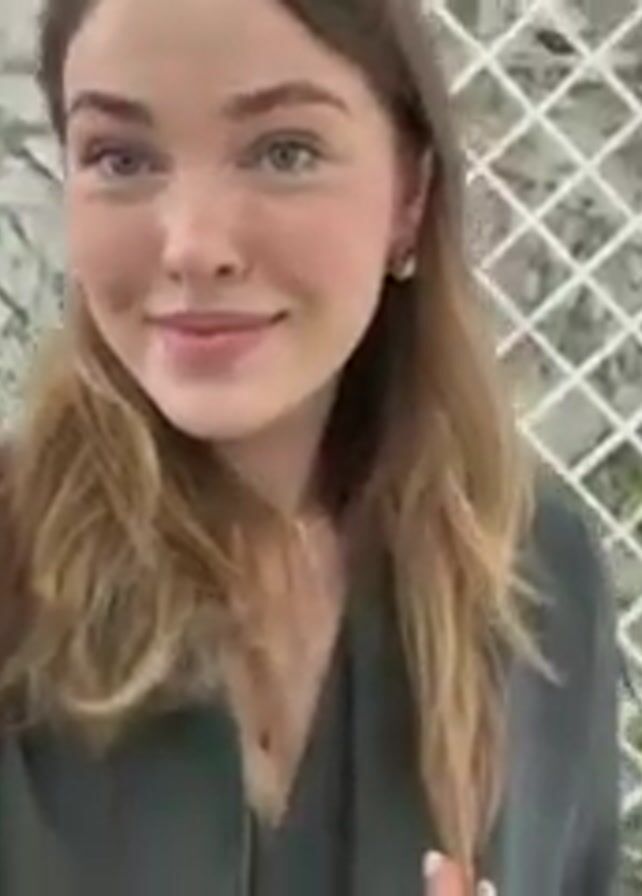 A young woman films herself in what appears to be a hotel or public building. She is wearing a gray jacket and has long brown hair. Behind her are white-tiled walls with a lattice pattern, along with plants in white pots. People walk in the background and the building has a ramp. The woman is smiling and looking at the camera.