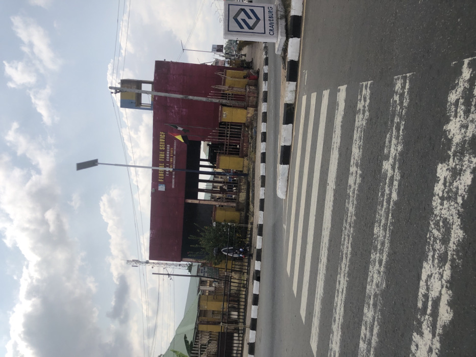 The scene depicts the Federal Fire Service Zone J Command station in Owerri, Imo State, Nigeria, viewed from a street-level perspective under a partly cloudy sky