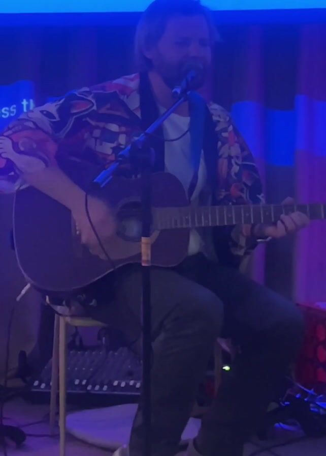 A man with medium-length blondish hair is sitting on a metal stool, playing an acoustic guitar, and singing into a microphone