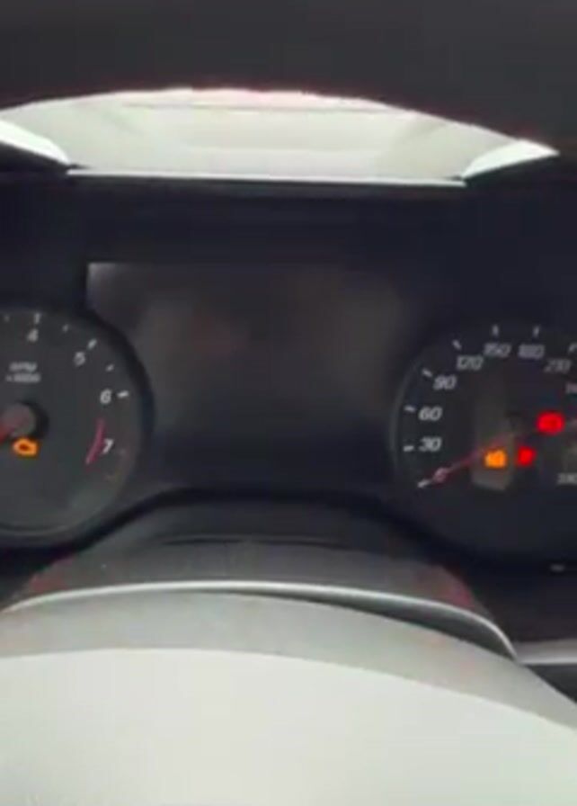 view of a car's dashboard from behind the steering wheel. Initially, the dashboard is dark, but when the ignition is turned on, the gauges light up. The left gauge measures RPM, while the right one measures speed in kilometers per hour. Several warning lights appear, indicating various system checks and alerts. The car appears to be stationary in park, as indicated by the 'P' on the dashboard display.
