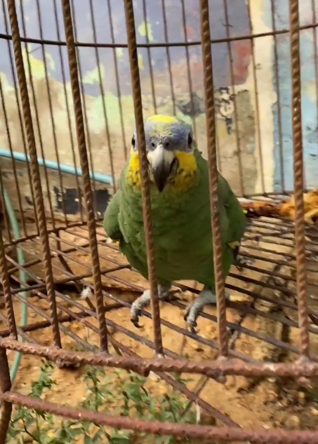 - "close-up of a green parrot with yellow and blue markings on its head, confined within an old, rusty wire cage" by FM-GIPAv2, licensed under CC BY 4.0