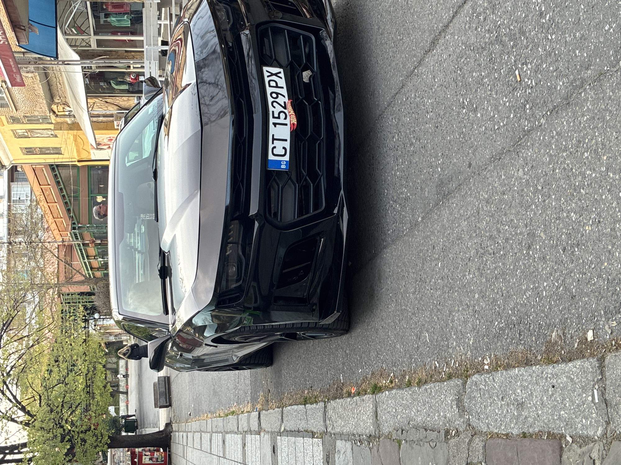 black car parked on a street in Stara Zagora, Bulgaria. The license plate reads "CT 1529 PX". A tree with green leaves is on the left. Buildings are visible in the background. A sidewalk borders the street on the right.
