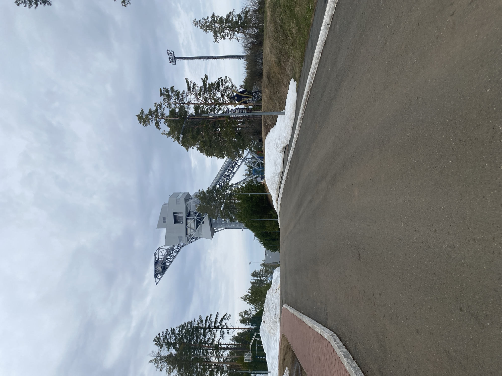 gray asphalt road curving to the right, bordered by a red brick edge and patches of snow. To the left of the road, a large ski jumping ramp constructed from white metal beams and a white building is visible. Trees are scattered around the ramp. Further back, additional trees and a tall metal light pole are present. The sky is overcast with gray clouds. The scene is located in Прикамский, Russia. A figure on a bicycle is visible in the distance, slightly to the right of the center.