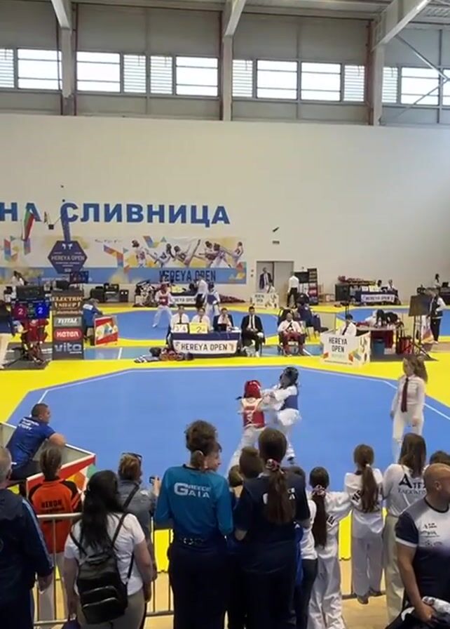 - "Taekwondo match taking place in a large gymnasium with a blue and yellow circular competition area in the center" by FM-lpmjW2, licensed under CC BY 4.0