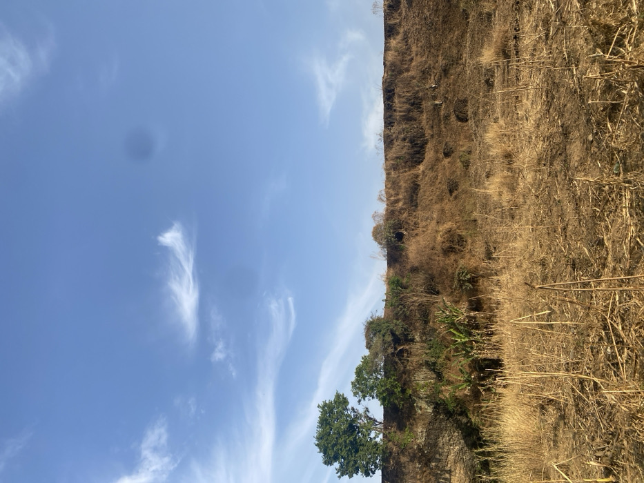 A landscape image shows a blue sky with wispy clouds on the left and a dry, brown hillside on the right. The hillside appears to be covered in dry grass and some sparse vegetation, including a few green trees. There is a dark spot in the upper left area of the sky. The perspective is slightly tilted, making the horizon line diagonal.