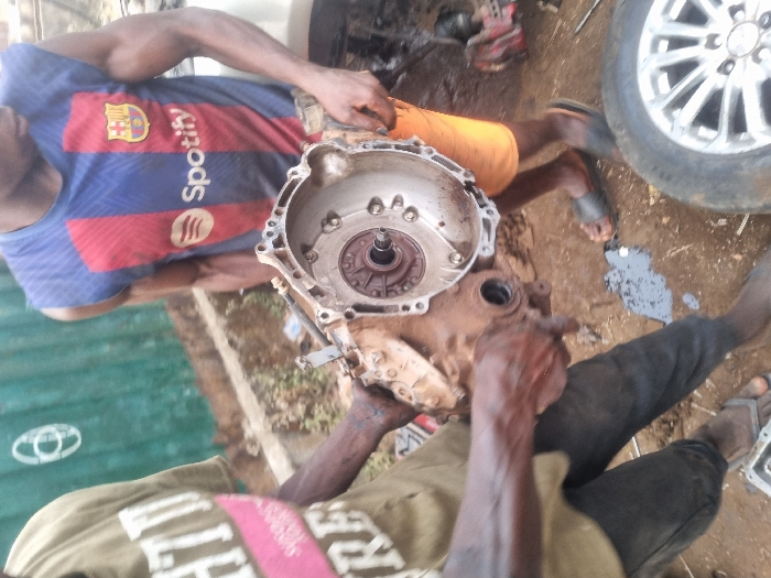 Two individuals are working on a car transmission. One wears a Barcelona FC shirt. The transmission is metallic and has a circular opening with internal components visible. The other person is wearing a light-colored shirt and dark pants. Tools and car parts are scattered around. A wheel is also present. There is evidence of fluid leakage on the ground.