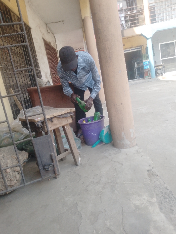An adult male wearing a black baseball cap, a light blue striped long-sleeved shirt, and dark trousers is depicted in an outdoor urban setting in Lagos, Nigeria. He is observed bent forward, holding a green glass bottle with both hands, positioned over a purple plastic bucket on the ground, apparently pouring its contents into it. The bucket already contains a second green glass bottle. A light blue plastic scoop lies on its side next to the bucket, at the base of a large, cylindrical concrete pillar which occupies the mid-right portion of the frame. To the man's left, a wooden stool with a light-colored top stands near a dark rectangular metal object with a visible latch. The immediate foreground on the left features a vertical metal grille. In the background, weathered concrete buildings with security grilles on windows and doors are visible. A partial "JUMIA" sign is affixed to one building. Further in the background on the right, a small portable generator rests on the paved ground. The ground throughout the scene consists of worn, cracked concrete. The overall environment suggests a commercial or mixed-use area within the city.