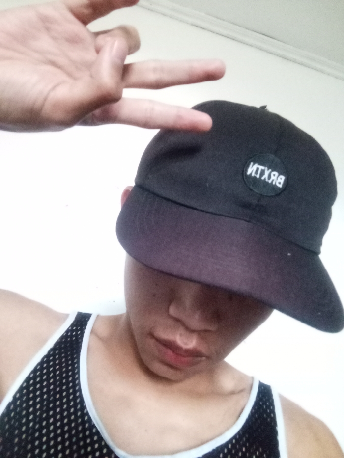 A low-angle shot captures a person wearing a black baseball cap with a circular white logo bearing the word "BRIXTON" (reflected). The cap's brim casts a shadow over the person's eyes. The person makes a hand gesture resembling a "W" or upside-down "M" near their head. They wear a black mesh tank top with white trim, against a plain white background. The lighting is diffused, creating soft shadows and highlights.
