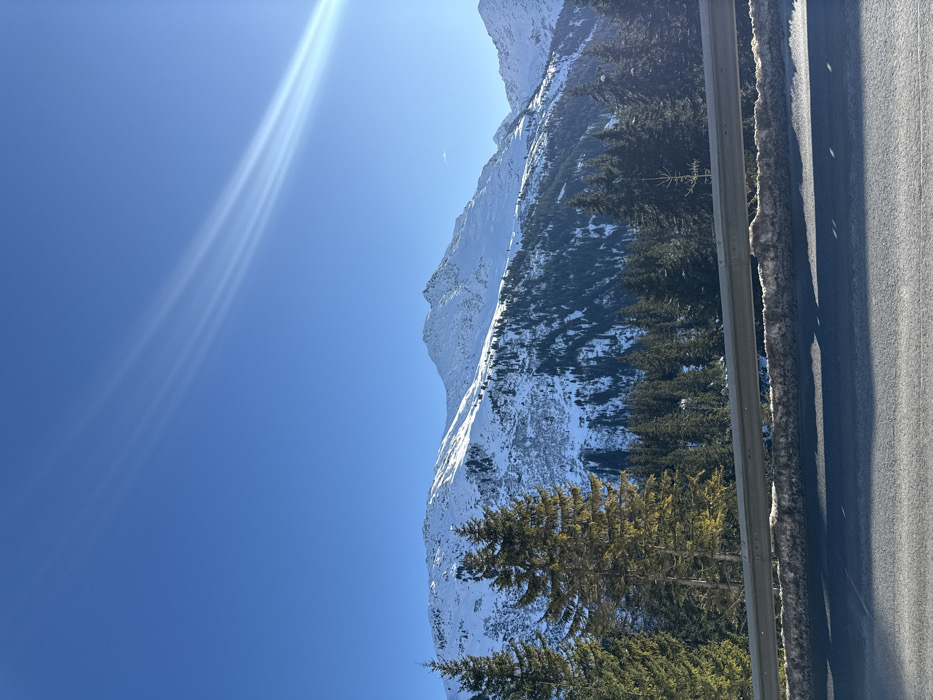 The image depicts a winter mountain landscape in St. Christoph, Austria, under a clear, bright blue sky. Snow-covered peaks and slopes dominate the mid-ground and background, with coniferous forests covering the lower mountain flanks. The foreground features a dark asphalt road surface, above which a metallic silver guardrail runs horizontally across the frame. Behind the guardrail, accumulated dirty snow and ice are visible, along with several tall, sun-illuminated coniferous trees. Multiple parallel light rays, indicative of sun glare, emanate from the upper right quadrant of the sky. No individuals, animals, or active human interactions are present.