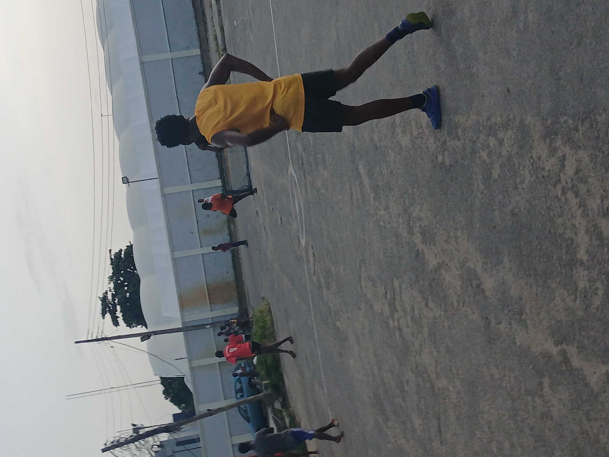 group of people outdoors in Lagos, Nigeria. The main subject is a person in a yellow shirt and black shorts, stretching with hands on hips. Other people are visible in the background, wearing red shirts. They appear to be on a paved court or field, possibly engaged in exercise or sports training. A large white structure is present in the background, along with utility poles and trees. A few cars are parked nearby. The sky is overcast.