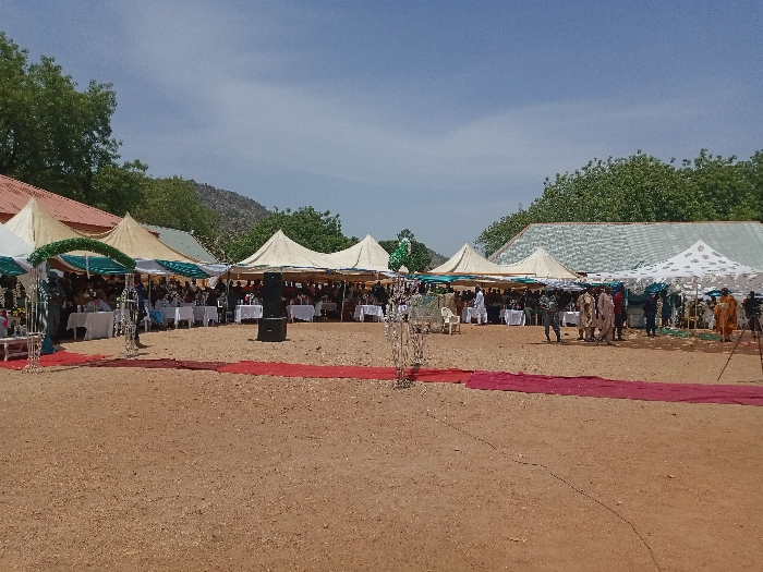 large outdoor gathering in Zum, Nigeria, located at the coordinates 10.116 latitude, 13.046 longitude. The event is taking place on a sandy ground, with several white tents set up, likely for a wedding or other celebration. There are many people present, mostly dressed in traditional attire. The scene features a red carpet leading to the tents, and there are some trees and a low-lying building in the background. The event appears to be well-organized, with tables and chairs set up under the tents. A large speaker system is set up in front of the main tent. The atmosphere is festive and crowded. The event is likely taking place during the day, as the sky is clear and bright.