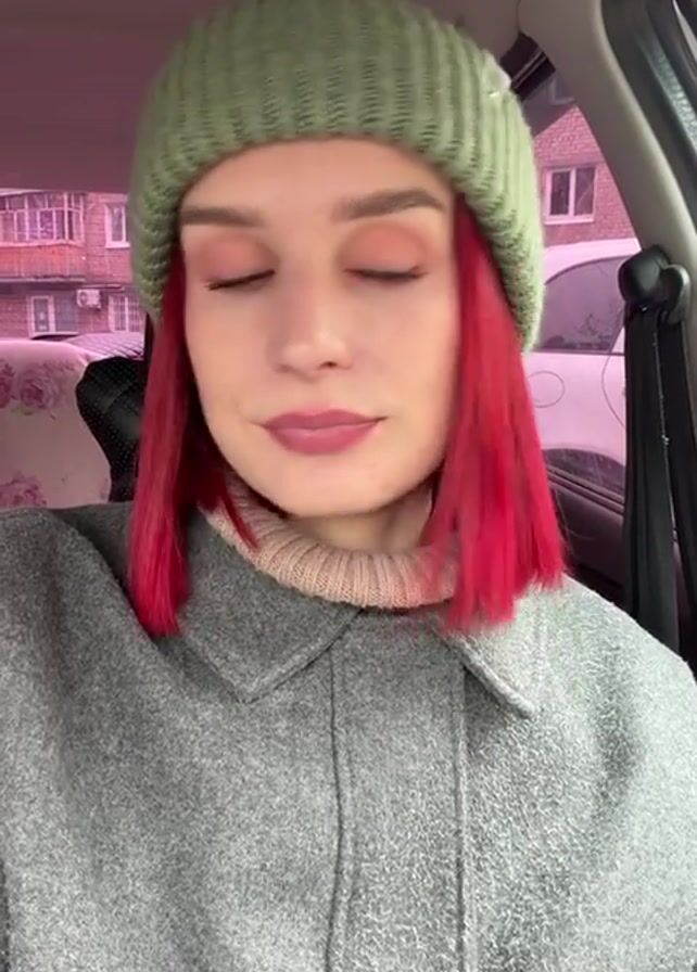 - "A young woman with red hair, wearing a green beanie and grey coat, sits inside a car and eats a sandwich wrapped in plastic" by FM-9zhk43, licensed under CC BY 4.0