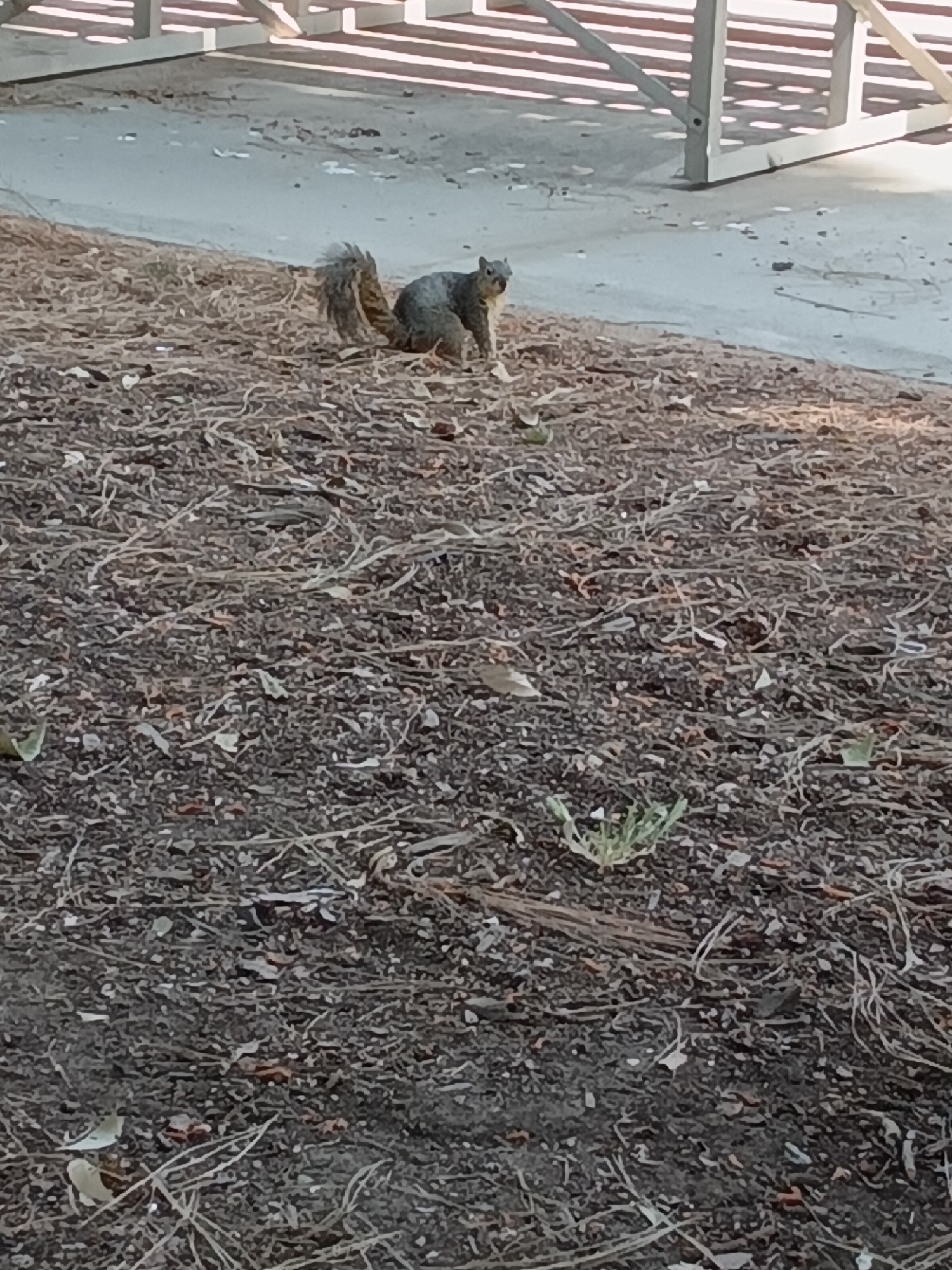 A single gray squirrel is positioned in the upper center of the frame, facing the viewer. It stands on a surface composed of dark brown, dry organic matter, including leaves, twigs, and sparse patches of green vegetation. The ground slopes slightly upwards towards the background, where a lighter gray concrete or paved surface is visible. Behind this paved surface, a light-colored structure with prominent horizontal slats or beams is partially visible, casting shadows across the concrete. The scene is illuminated by natural light. The specific location is in a park or open natural area within the city of East Los Angeles, United States. There are no other identifiable people or animals present.