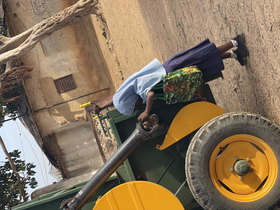 A young girl in a blue headscarf and school uniform stands on a green agricultural machine, possibly a thresher, against a backdrop of a rustic building. The machine features yellow components and a large tire. The girl is holding onto parts of the machine, seemingly operating it. The setting appears to be a rural area with a dirt ground.