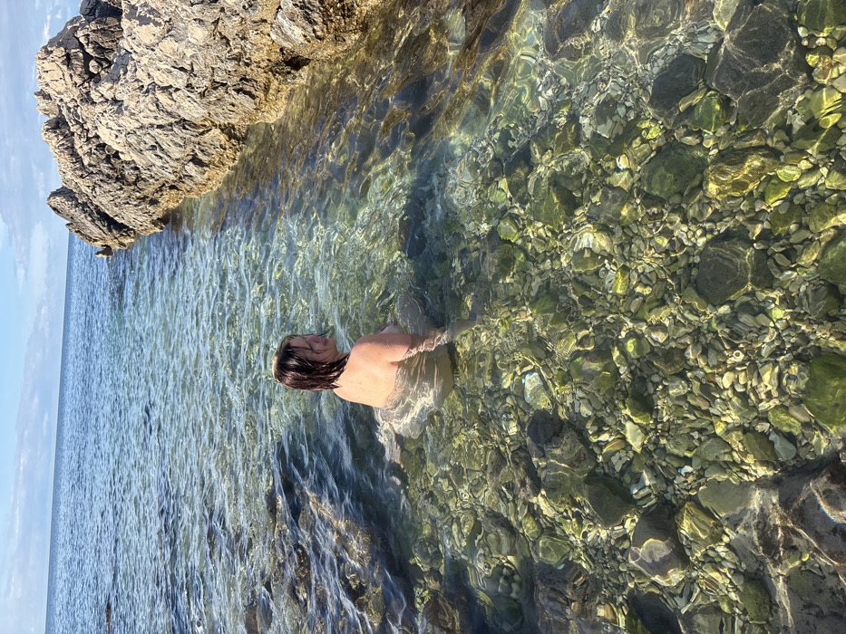 The image captures a coastal scene in Kunje, Montenegro. A person, identified as female, with wet, shoulder-length dark hair, is partially submerged in clear, shallow water. She is positioned with her back mostly towards the camera, turning her head to look towards the right of the frame. Her bare shoulders and upper back are visible above the water line, while the remainder of her body is obscured by the water. The transparent water reveals a seafloor composed of various-sized light-colored rocks and pebbles, some exhibiting greenish coloration. To the right, a prominent formation of light brown, weathered rock extends into the water, creating a natural boundary. The background consists of the open sea extending to the horizon under a light blue sky with scattered clouds.