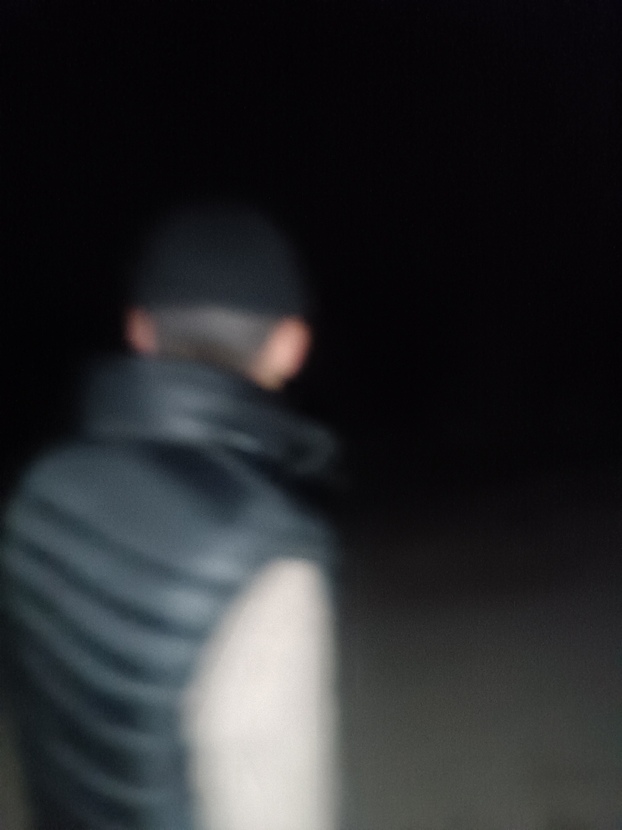 A severely out-of-focus image taken in Shamsikul, Uzbekistan, depicts the upper back of an individual in an extremely low-light environment, likely nighttime