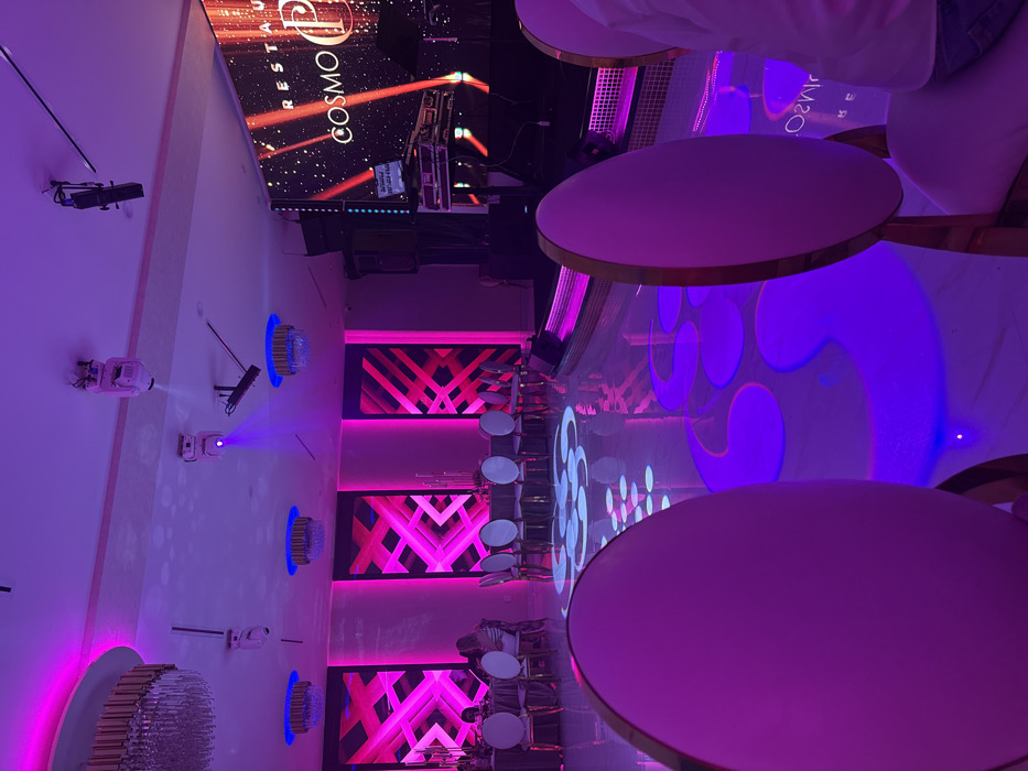 The image captures the interior of an event hall, identified as the Cosmopolitan Ballroom & Restaurant, located at 8225 Van Nuys Blvd, Panorama City, Los Angeles, California, United States of America. The scene is illuminated predominantly with magenta and purple lighting, creating a vibrant atmosphere. The floor is white, highly reflective, and features projected blue and purple circular and abstract light patterns. In the left and mid-ground, several round tables draped with grey tablecloths are arranged. Each table is surrounded by multiple white chairs with gold-toned frames. A few individuals are seated at these tables, partially visible and obscured by the foreground. The walls are light-colored and incorporate vertical illuminated panels displaying abstract magenta geometric patterns. The ceiling is white and supports a variety of lighting fixtures: ornate crystal chandeliers with gold accents, circular fixtures emitting blue light, and professional stage lighting units, including moving head projectors that cast patterns onto the floor. To the right, a raised stage is present, backed by a large LED video wall. This screen displays the text "RESTAURANT COSMO" and "COSMOPOLITAN" against a starry background with red light beams. Below the screen, a DJ booth with audio equipment and speakers is visible. The edge of the stage is lined with magenta strip lighting. In the immediate foreground, two out-of-focus white chairs with gold frames are prominently positioned, viewed from behind. A person is seated in the chair on the far right, with their back to the viewer.