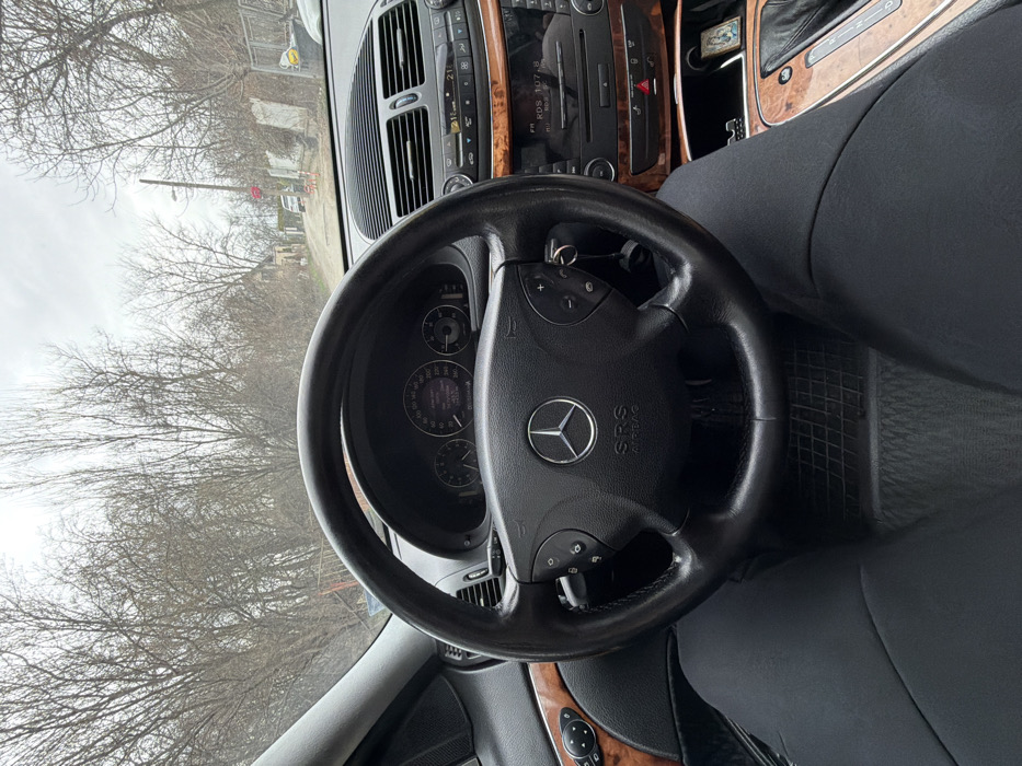 The image presents a first-person view from the driver's seat of a Mercedes-Benz E-Class (W211 generation)