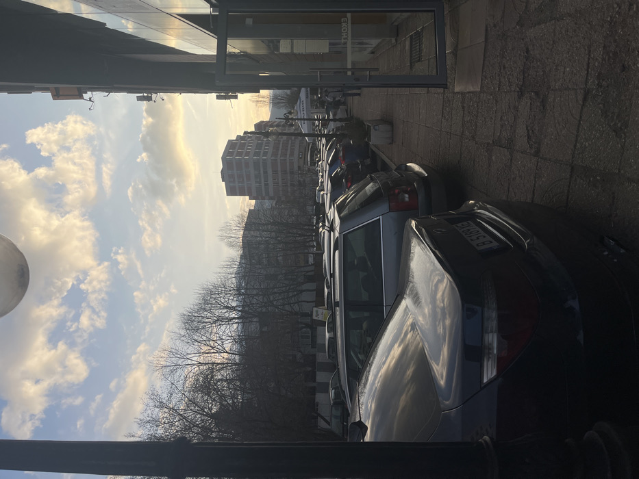 The image displays an urban street scene in Sofia, Bulgaria, located on Boulevard Tsar Boris III, likely near the intersection with Ulitsa Pirinski Prohod. The lighting conditions suggest late afternoon or early morning, with a low sun angle illuminating scattered cumulus clouds in a blue sky, casting a warm, golden hue towards the horizon. The trees lining the street are devoid of foliage, indicating a late autumn, winter, or early spring season. In the immediate foreground on the left, a dark-colored BMW sedan is parked, its rear end and trunk reflecting the sky. The vehicle bears a Bulgarian license plate, B 5189 YE. A dark lamppost partially obstructs the car on the left edge of the frame. To the right, a sidewalk constructed of dark, irregularly shaped paving stones runs parallel to the street. Adjacent to the sidewalk on the right is the glass facade and entrance of a commercial building, reflecting portions of the sky and interior. The mid-ground features a long line of parked vehicles, including a silver station wagon, extending into the distance along the street. Behind the parked cars, a row of bare-branched deciduous trees stands. Further down the street, a white banner with Cyrillic text, partially legible as "БАНКО" (BANKO), is visible. Two individuals, indistinct due to distance, are observed walking on the sidewalk in the far mid-ground, near the commercial building entrance. In the background, a prominent multi-story building with a distinctive stepped or tiered architectural design is visible slightly right of center. Other urban structures are present behind the tree line. The distant horizon reveals faint outlines of mountains or hills. A large, light-colored, spherical street light fixture is partially visible at the very top center of the frame.