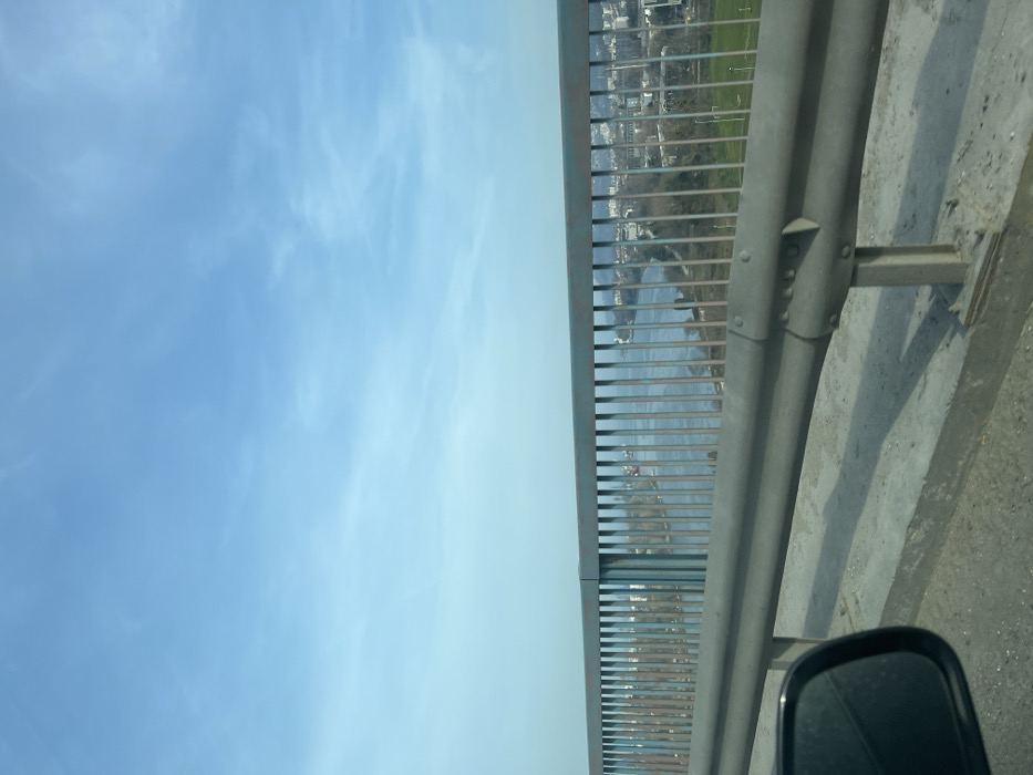 The image depicts an elevated view from the Asparuhov Bridge in Varna, Bulgaria, overlooking a section of the Varna Lake/Canal and the surrounding cityscape. The upper half of the frame is dominated by a clear, light blue sky featuring minimal, diffused white cloud formations. The lower half details the bridge infrastructure and the vista beyond. In the immediate foreground, the left side mirror of a vehicle is partially visible in the bottom-left corner, indicating the perspective is from inside a car traveling on the bridge. A gray metal guardrail, secured by bolts and structural supports to a concrete barrier, extends horizontally across the lower mid-frame. Above this guardrail, a metal pedestrian railing, painted a faded blue or greenish hue, features regularly spaced vertical bars that create a visual grid. Below the bridge structure, a wide body of water, exhibiting a calm, reflective surface that mirrors the sky, stretches horizontally across the scene. On the left bank of the water, distant industrial or port facilities are visible, including a prominent reddish structure or vessel. On the right bank, a portion of the Varna urban environment is distinguishable, characterized by multi-story buildings and interspersed green areas. No individuals or specific actions are discernible within the frame.
