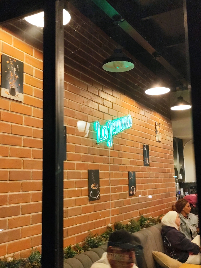 The image captures an interior view of a cafe or restaurant, observed through a reflective glass pane, located in the city of Joubar Municipality, Syria. A prominent feature is a brick wall composed of reddish-brown bricks, on which a turquoise neon sign spelling "La Gemma" is mounted centrally. Various rectangular artworks are affixed to the brick wall: one on the far left displays a black pot with white elements, while three dark panels below the neon sign depict stylized coffee cups with steam. The dark ceiling features multiple black industrial pendant lights with wide shades, some emitting warm white light, one with a green hue. Two semicircular white wall lights are visible on the upper left. A long, grey upholstered banquette with segmented cushioning runs along the base of the wall, fronted by a low row of small green plants. Two females are seated on the banquette towards the right side of the frame: one wearing a light headscarf and a dark top, and another with curly brown hair wearing a light-colored jacket. Both individuals are looking towards the right. In the immediate foreground, a blurred individual wearing a dark cap is partially visible through the reflective glass.
