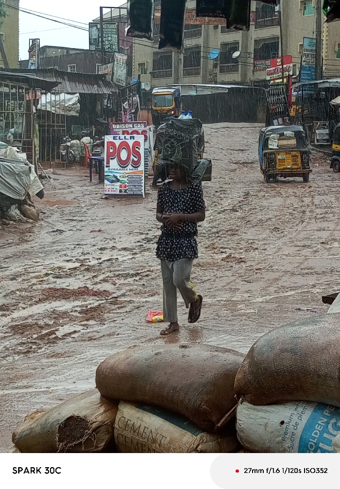 This image captures a rainy, muddy street scene in Onitsha, Nigeria, characterized by urban commercial activity