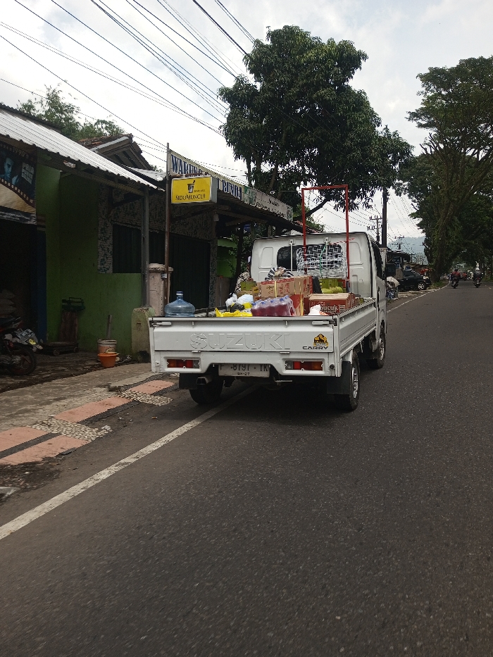 A white Suzuki Carry pickup truck, loaded with various merchandise, is positioned on an asphalt road in Khajuripada, India. The truck is viewed from its rear-left, and its bed contains multiple cases of bottled beverages in red packaging, several plastic bags of goods, and a large blue plastic water dispenser bottle. A red rectangular metal frame is attached to the rear of the cab. The vehicle's license plate displays "F 8197 TK". To the immediate left of the truck, a patterned sidewalk, composed of reddish and light-colored tiles, runs alongside a single-story building with a light green painted facade and a corrugated metal roof. A yellow rectangular sign reading "WARKOP BUNDA" is mounted on a pole in front of this building, with a smaller yellow sign featuring a mortar and pestle icon and the text "SIDOMUNCUL" below it. A partial banner with "PRIA DEWASA" is visible on the far left. An orange bucket and other debris are present on the sidewalk. The asphalt road features a faded white line marking the lane edge on the left. Numerous power lines stretch across the upper portion of the frame. The background consists of abundant green trees, and distant hills are faintly discernible under an overcast sky. Further down the road, indistinct motorcycles are visible. No identifiable individuals are present in the immediate foreground.