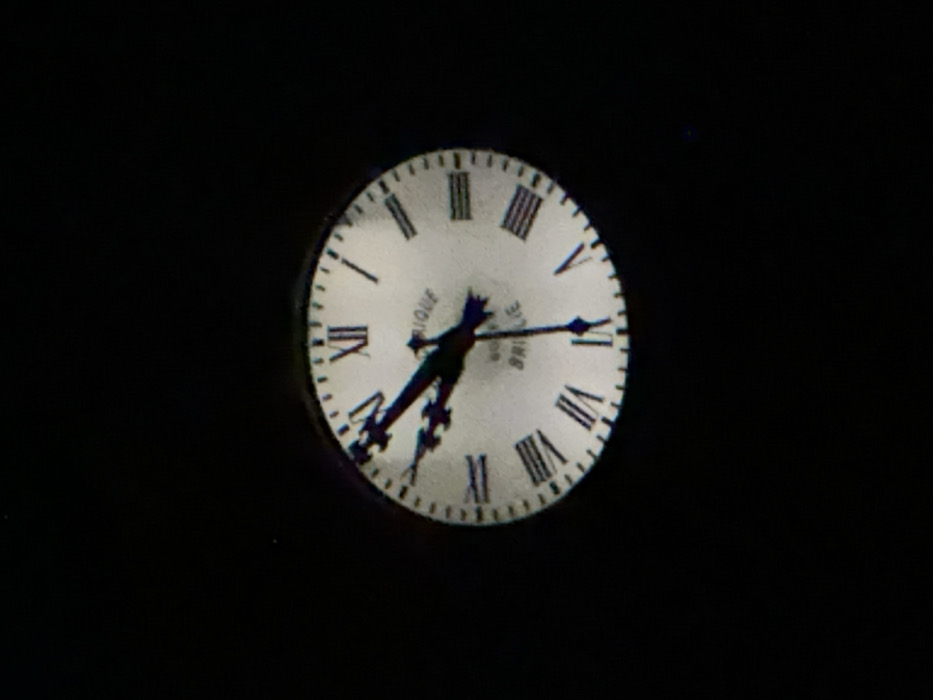 - "A vertical, low-light photograph captures a circular, illuminated clock face against an entirely black background" by FM-pSbZP2, licensed under CC BY 4.0
