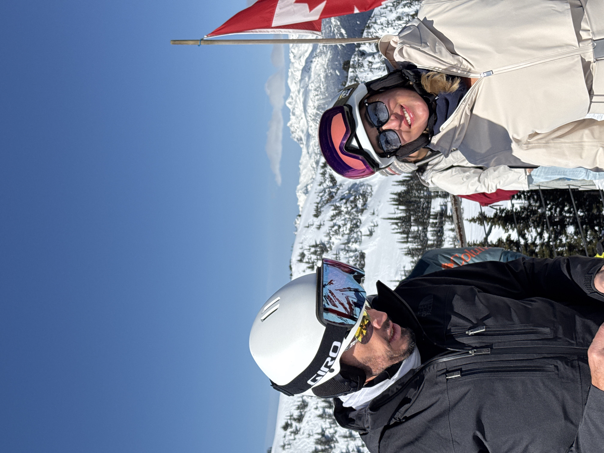 Two people wearing ski apparel, including helmets and goggles, pose for a photo. In the background is a view of snowy mountains and trees under a clear blue sky. A Canadian flag is visible in the upper portion of the image. The location is likely Whistler, Canada, due to the mountainous terrain and the presence of the Canadian flag.
