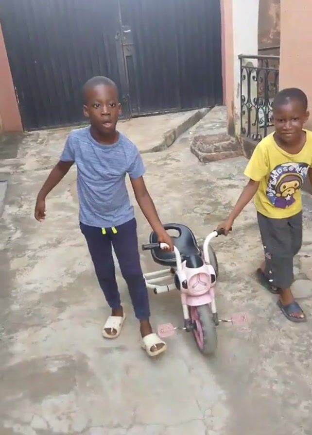 Two young boys are standing on a concrete ground next to a pink tricycle. The boy on the left is wearing a blue shirt, dark pants, and white sandals. The boy on the right is wearing a yellow shirt, grey pants, and blue sandals. He is holding the handlebars of the tricycle. A closed black gate is visible in the background. The building is painted a light peach color. The concrete ground appears to be in a courtyard.