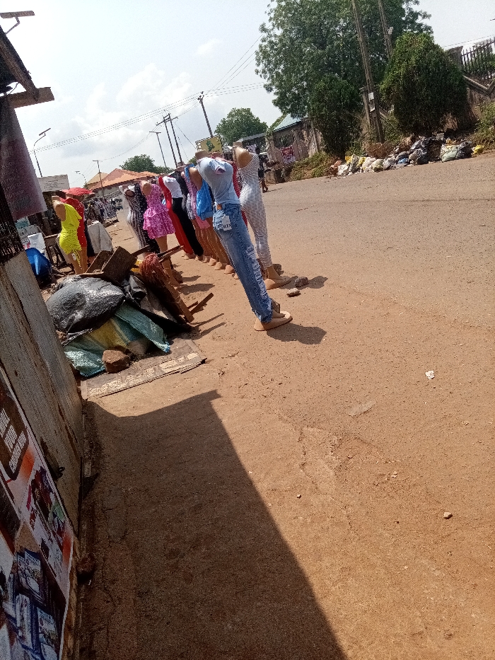 The image depicts an outdoor commercial scene along a reddish-brown unpaved road in an unspecified city. A row of approximately twelve headless female mannequins, displaying various women's garments including dresses, tops, and jeans, stands on a raised dirt and gravel shoulder along the left side of the road. Two mannequins in the foreground wear light brown flat shoes; one is dressed in a light blue t-shirt and ripped blue jeans, the other in a striped full-length dress. Adjacent to the mannequins on the far left, a wooden structure, possibly a stall, is partially visible with papers affixed to it, casting a long shadow towards the foreground. Below the mannequins, debris consisting of black plastic bags, green tarpaulins, and wooden planks is present. The road itself shows signs of wear and is largely empty of traffic. In the background on the right, a large accumulation of black refuse bags and other discarded items lines the roadside, backed by dense green foliage and a fence. Utility poles with overhead wires are visible throughout the mid-ground and background. In the distant left, additional market stalls and faint human figures indicate a broader commercial district. The scene is illuminated by bright daylight, casting distinct shadows.