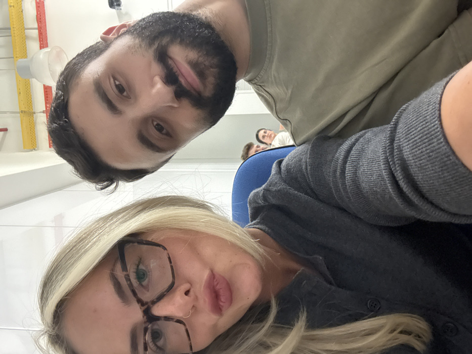 The image depicts a close-up indoor self-portrait of two individuals, with two others partially visible in the background, presumably taken in Herzliya, Israel. In the foreground, a blonde woman with shoulder-length hair, wearing tortoise-shell rimmed glasses and a dark gray collared sweater, looks directly at the camera with her lips puckered. She has a subtle nose piercing. To her right, a bearded man with dark hair, wearing a light olive green short-sleeved shirt, also looks towards the camera with a slight smile. Behind the woman, a blue chair back is visible. In the mid-ground, two other individuals are partially visible: a male figure's head behind the woman, and a female figure's head behind the man, both appearing to face forward in the room. The background suggests an indoor, institutional environment with white walls, overhead fluorescent lighting, and visible ceiling infrastructure, including yellow and red cable trays or ducts.