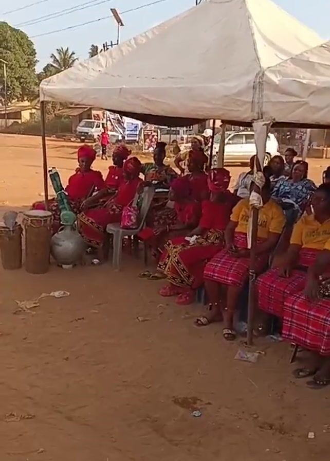 Under a white tent, a group of women sit in chairs arranged in rows. Many of the women are wearing matching outfits consisting of a red head wrap, a red top, and a red plaid skirt. Some women wear yellow t-shirts with red plaid skirts. Between the rows of chairs are several drums and large earthenware pots. The ground is dirt. In the background are vehicles parked on a street. In the sky is a telephone pole.