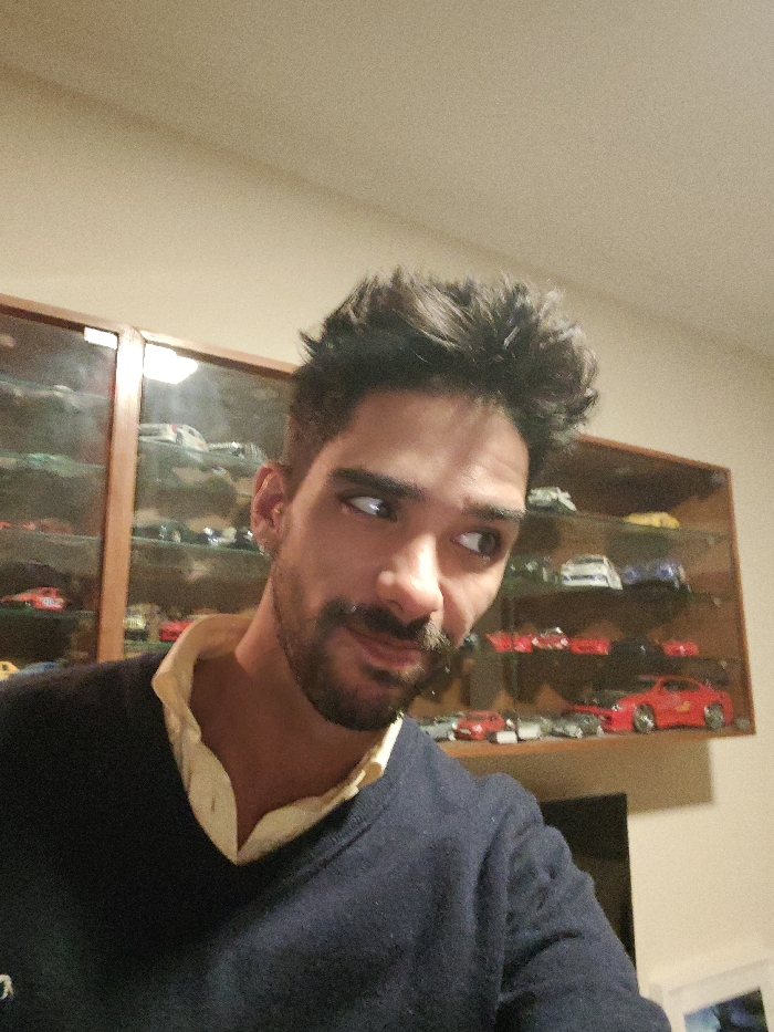 A man with dark hair and a trimmed beard glances sideways. He's wearing a navy V-neck sweater over a light yellow collared shirt. Behind him, a wooden cabinet showcases an array of miniature cars. The lighting is soft, and the background includes a glimpse of what appears to be a dark screen.